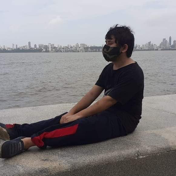 Image description- Kumar Mahavir sitting on the plank with stretched out leg on the sidelines of Arabian sea in the Marine Drive . He is wearing black T- shirt and blue trackpants with red stripe . His eyes are closed and body in meditating posture. He is wearing a green camouflaged mask